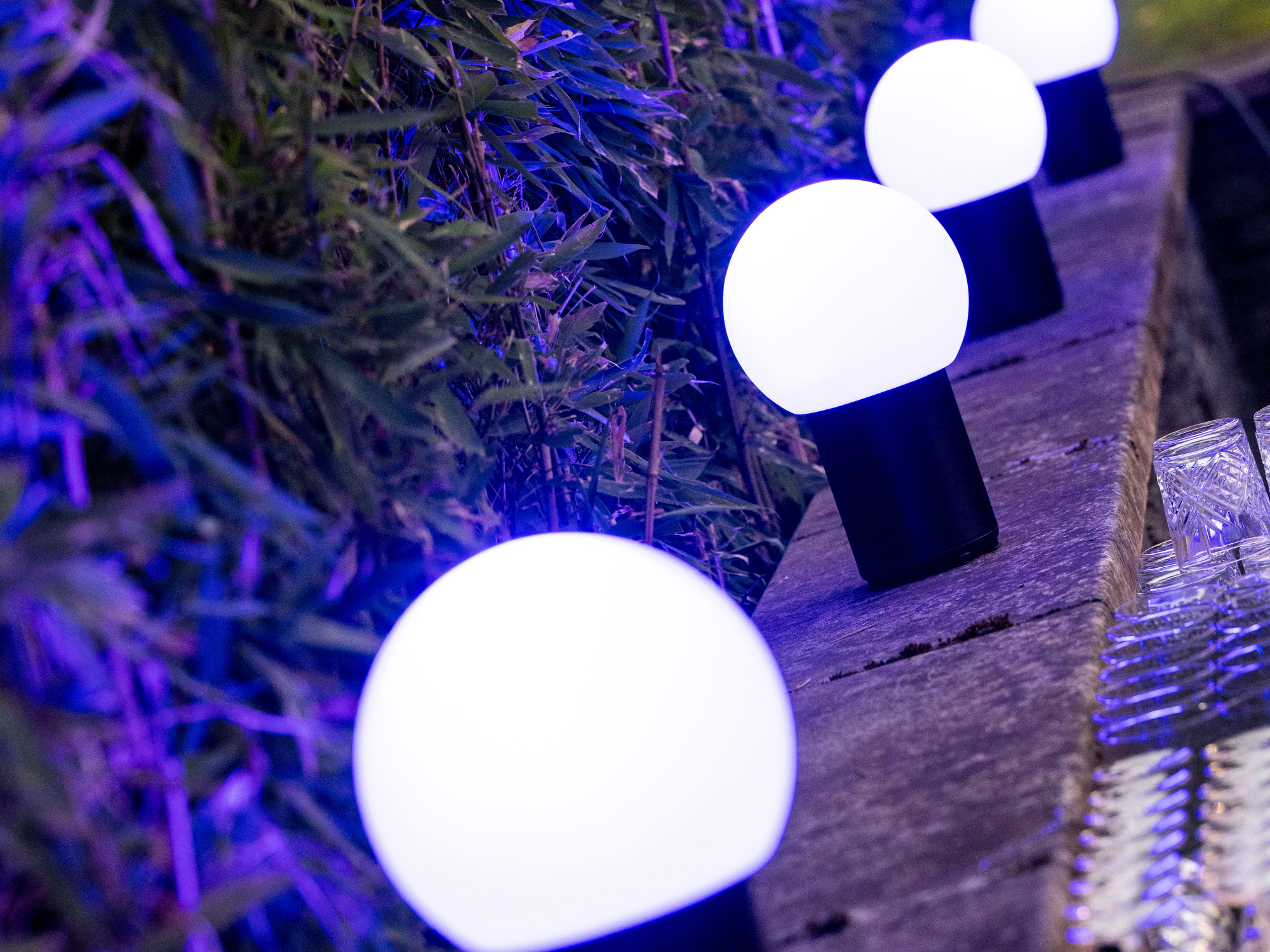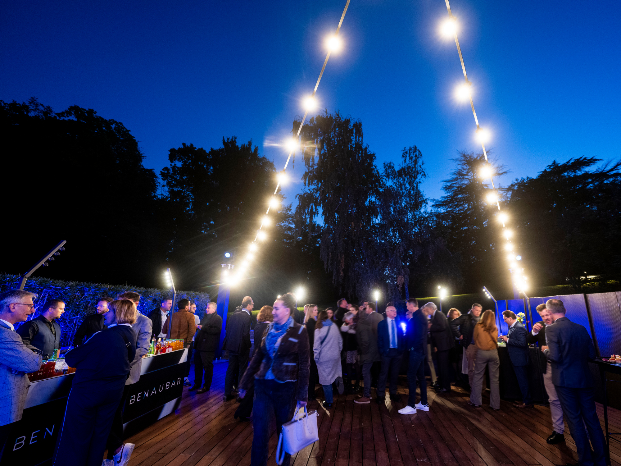 Des Well Fit et Alcor sur batterie en extérieur, avec des projecteur LED T4 pour éclairer le cocktail et des guirlandes guinguettes blanches pour un rendu à la fois festif et raffiné.