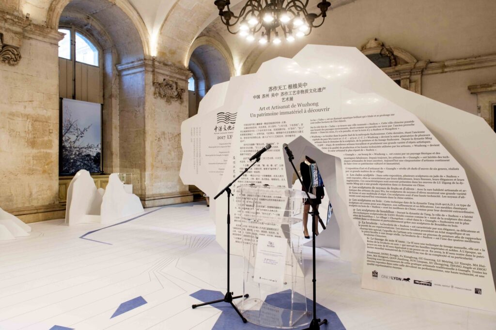 C’est au seinde l’Atrium de l’Hôtel de Ville de Lyon que s’est tenue l’exposition « Le bonheur d’artisanat du patrimoine culturel immatériel de Suzhou » réalisée par l’agence Ivanhoé. Cet événement qui mettait en scène divers ateliers de tissage et autres oeuvres culturelles a été équipé en matériel audiovisuel d’Eurosono avec notamment des enceintes pour la diffusion sonore, des écrans vidéo sur pieds, ainsi qu’un pupitre avec micros pour assurer la présentation.